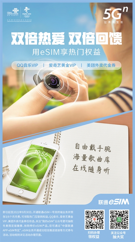 近期,中国联通又推出了“双倍热爱,双倍回馈”的联通eSIM一号双终端业务办理促销活动。即日起至2022年9月30日,用户开通一号双终端业务后,可通过“中国联通APP-eSIM专区”、eSIM业务开通成功短信推送链接等方式参与活动。在中国联通APP平台预存3个月或6个月的功能费,可获得QQ音乐VIP、爱奇艺黄金VIP等N多热门权益,关注“我的eSIM”公众号,更有机会抽取冬奥限定版徽章,抢购特价eSIM产品。