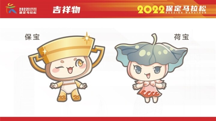 2022保定马拉松的吉祥物为“保宝”和“荷宝”。男宝,昵称“保宝”,“保”取自于“保定”的“保”字,具有城市代表的寓意。其整体造型从一座金色的冠军奖杯演化而来,象征着保定“奥运冠军之城”的光辉形象。女宝,昵称“荷宝”,“荷”取自于全国重点文物保护单位古莲花池,荷花莲叶元素象征着蓬勃的生命力。