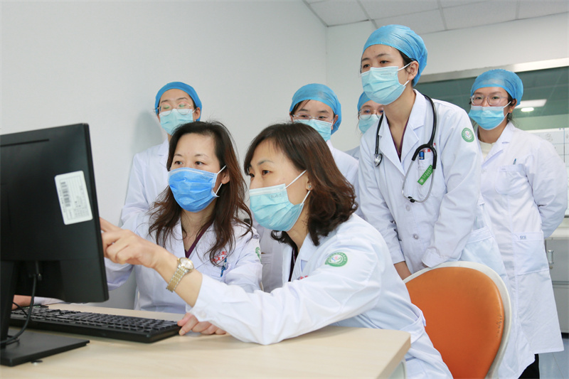 北京儿童医院保定医院肾病二科主任王辉(前排左)和科室医护人员探讨病情。河北日报通讯员任颖供图