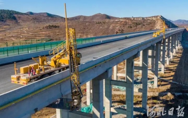 由于在燕山山脉中穿行,京秦高速公路遵秦段全线包括桥梁47座、隧道13座,施工难度较大。其中,全线最长装配式大桥——滦河特大桥,全长4.1公里,T梁共1600片,预制墩柱392根,预制盖梁196榀,采用全预制装配式建造技术,双柱墩和盖梁精准安装误差不能超过5毫米。