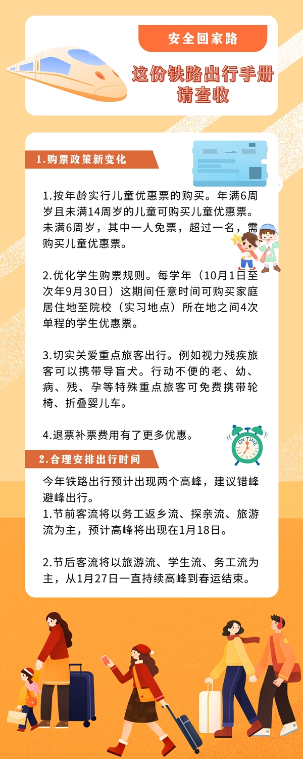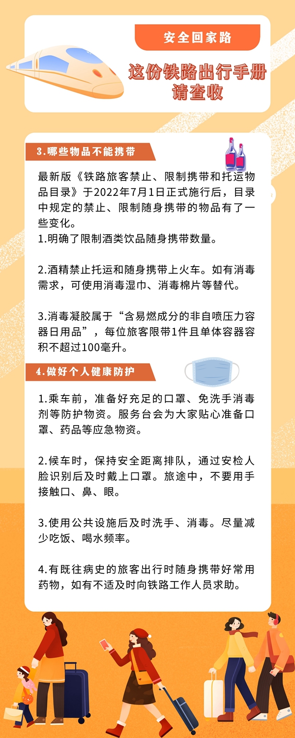 1月7日,为期40天的2023年春运正式启动。从目前的车票预售情况看,今年的春运客流高峰发送量或将达到2019年疫情前水平。铁路出行有哪些注意事项,哪些东西不能带上火车?如何做好个人健康防护?这份出行手册请查收。