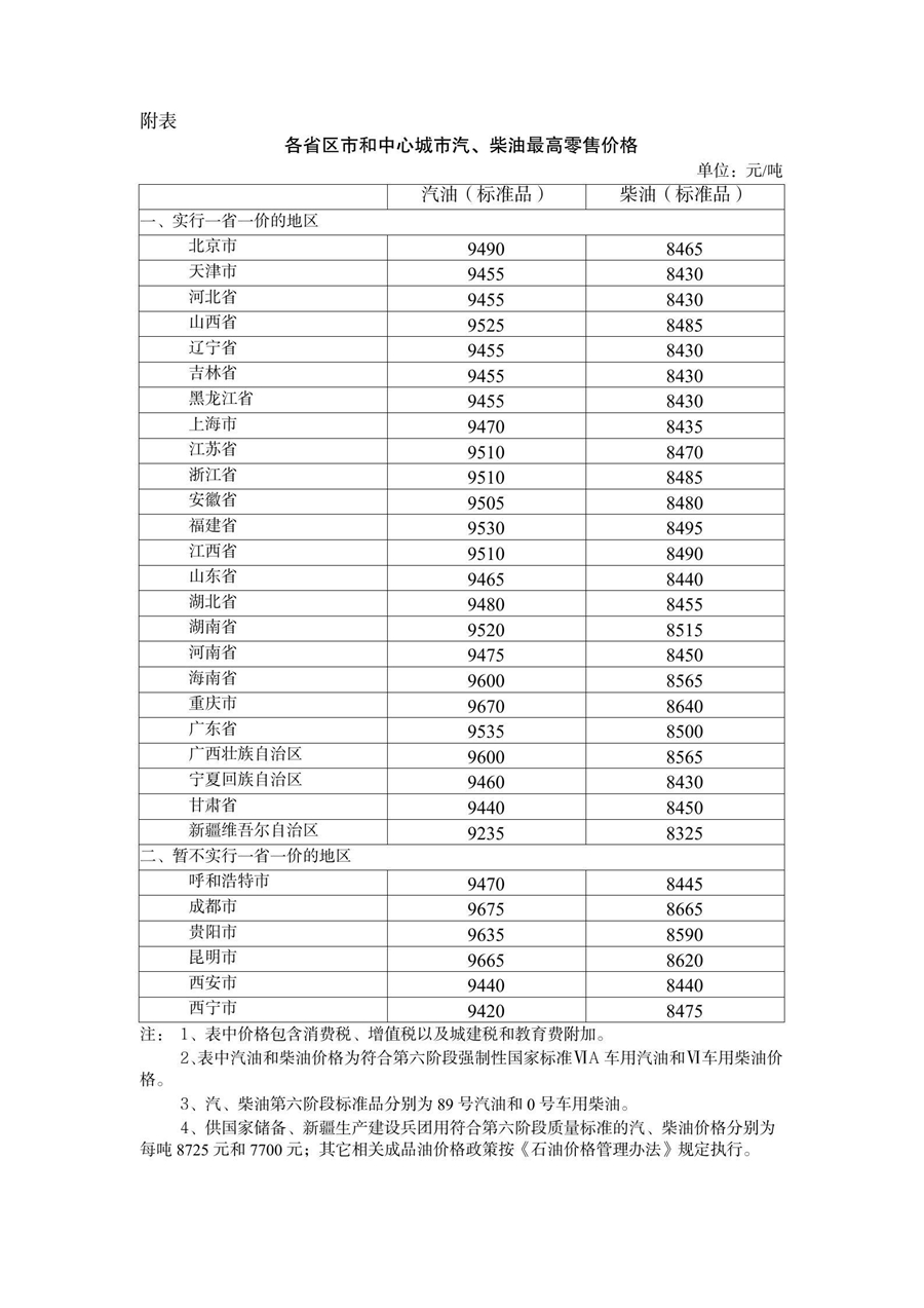 根据近期国际市场油价变化情况,按照现行成品油价格形成机制,自2023年1月17日24时起,国内汽、柴油价格(标准品,下同)每吨分别降低205元和195元。调整后,各省(区、市)和中心城市汽、柴油最高零售价格见附表。相关价格联动及补贴政策按现行规定执行。