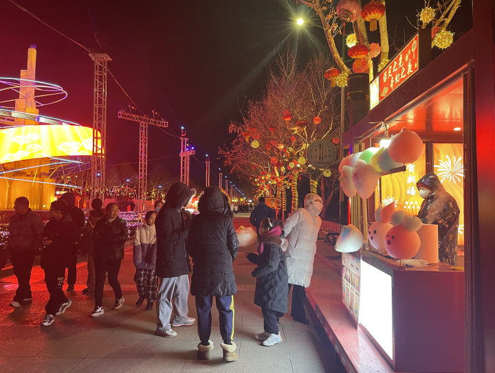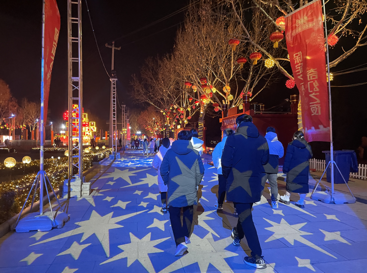 从正门进入园内,便来到了由灯光搭建而成的浪漫、梦幻、多彩的光影世界。高18米的“保定之光”主装置,搭配巨型环状屏幕,不断展示着城市的文化及发展成果。“非遗大道”让市民眼前一亮,摊位前灯光明亮、人头攒动,烤肉、雪花酪、牛轧糖等特色美食应有尽有,满足了市民的不同味蕾。投射到道路上的灯光不断变幻,一会儿是蓝色星星,一会儿是红色心形,小朋友们追逐着、跳跃着,现场十分欢乐。