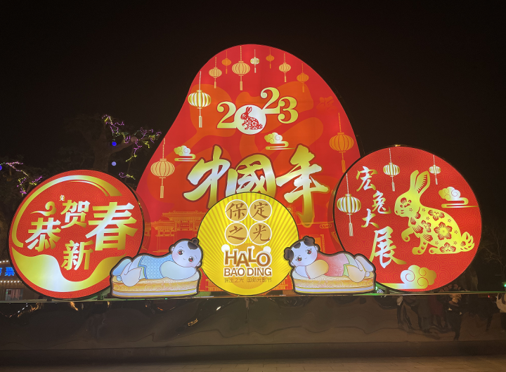 植物园正门广场上,标志性大树被璀璨的灯光装点,流光溢彩、火树银花,一派喜庆火红的春节气氛。12米高的“保定之光”巨幅灯光海报点亮夜空,其中,可爱俏皮的“保定之光”形象大使——“宝宝和顶顶”,引得不少市民朋友拍照打卡。据了解,“宝宝和顶顶”的设计灵感来源于曲阳定瓷“孩儿枕”,谐音保定,展现了古城深厚的地域特色和历史文化底蕴。