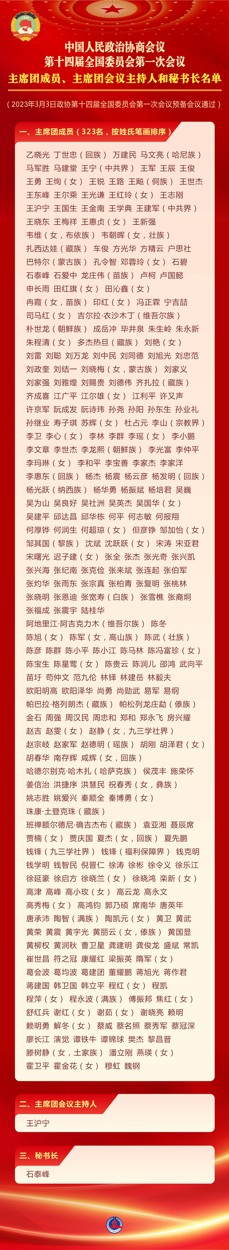 中国人民政治协商会议第十四届全国委员会第一次会议主席团成员 主席团会议主持人和秘书长名单