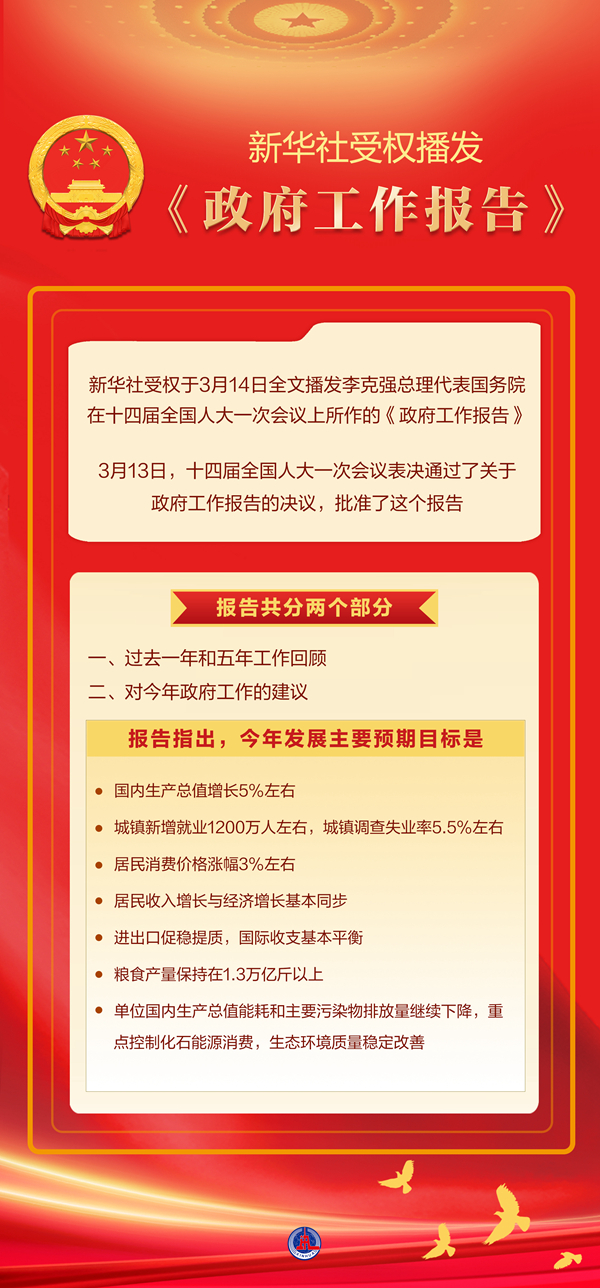 新华社北京3月14日电 新华社受权于14日全文播发李克强总理代表国务院在十四届全国人大一次会议上所作的《政府工作报告》。3月13日,十四届全国人大一次会议表决通过了关于政府工作报告的决议,批准了这个报告。