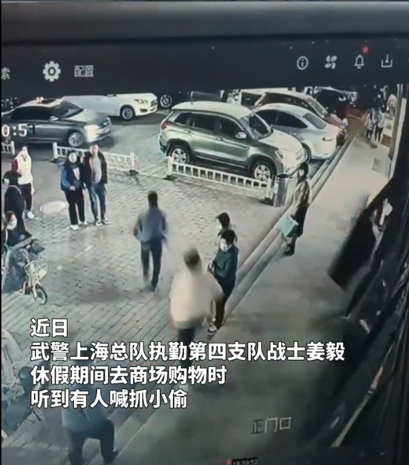 据了解,身穿运动服的男子是武警上海总队执勤第四支队机动中队战士姜毅,当天正是他休假期间,刚好也在该地购物。多年的军事训练,练就了他敏锐的洞察力,听到呼喊声,了解到事情原委,他迅速判明方向,锁定目标,朝男子逃跑方向追去,这才有了视频里抓住男子并移送警方的一幕。
