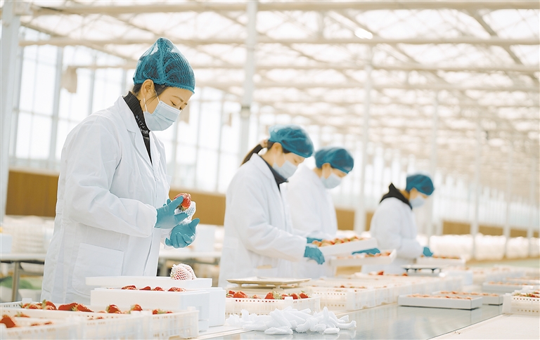 三月的顺平县腰山镇才良村,才良沃野草莓现代化农业园区一片火热繁忙景象。28个日光暖棚和一个5500平方米的智能玻璃温室依势而建,暖棚内一垅垅草莓秧有序排列生长,一颗颗草莓镶嵌其中,或玉颜娇媚或红如玛瑙。分拣流水线上,工人们正加紧称重、包装。一盒盒品质上乘的草莓,当天便会送至保定市区以及周边县(市)的各大商超。