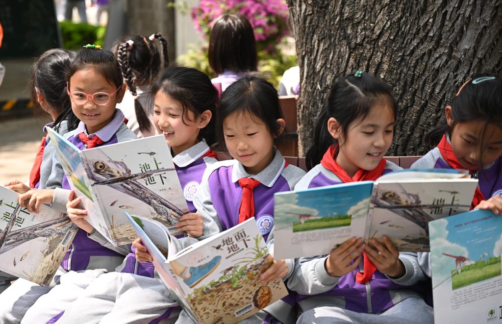 图为清华附小校园里孩子们在树下读书。采访对象供图