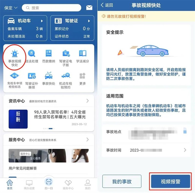 发生事故后,当事人在现场可通过下载“交管12123”APP,通过【事故视频快处】模块,进行视频报警处理,系统会自动定位事故地点信息。