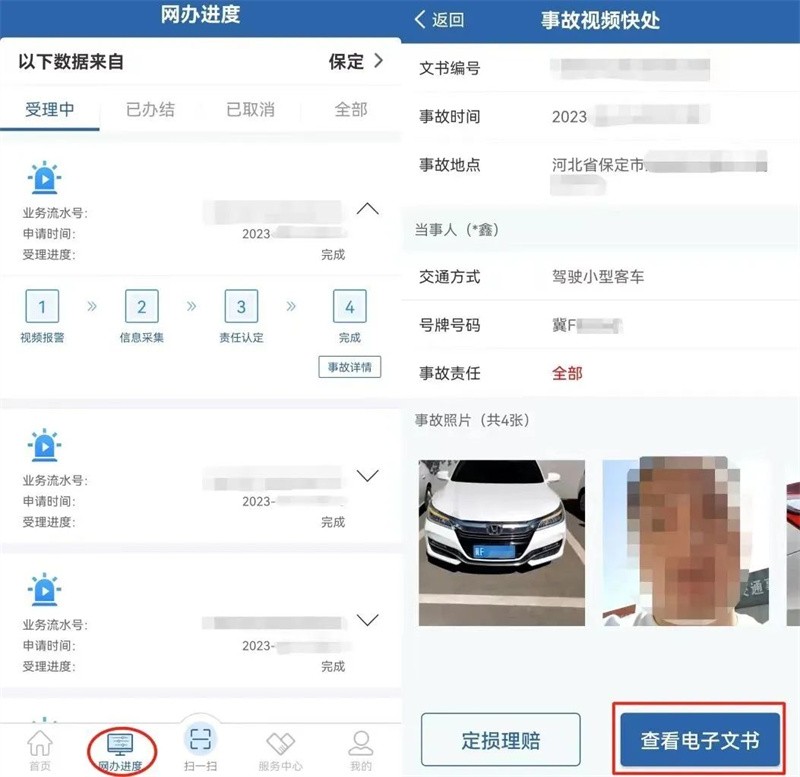 完成事故责任认定后,将通过手机短信告知当事人,当事人可通过“交管12123”APP【网办进度】查看事故责任及电子文书。