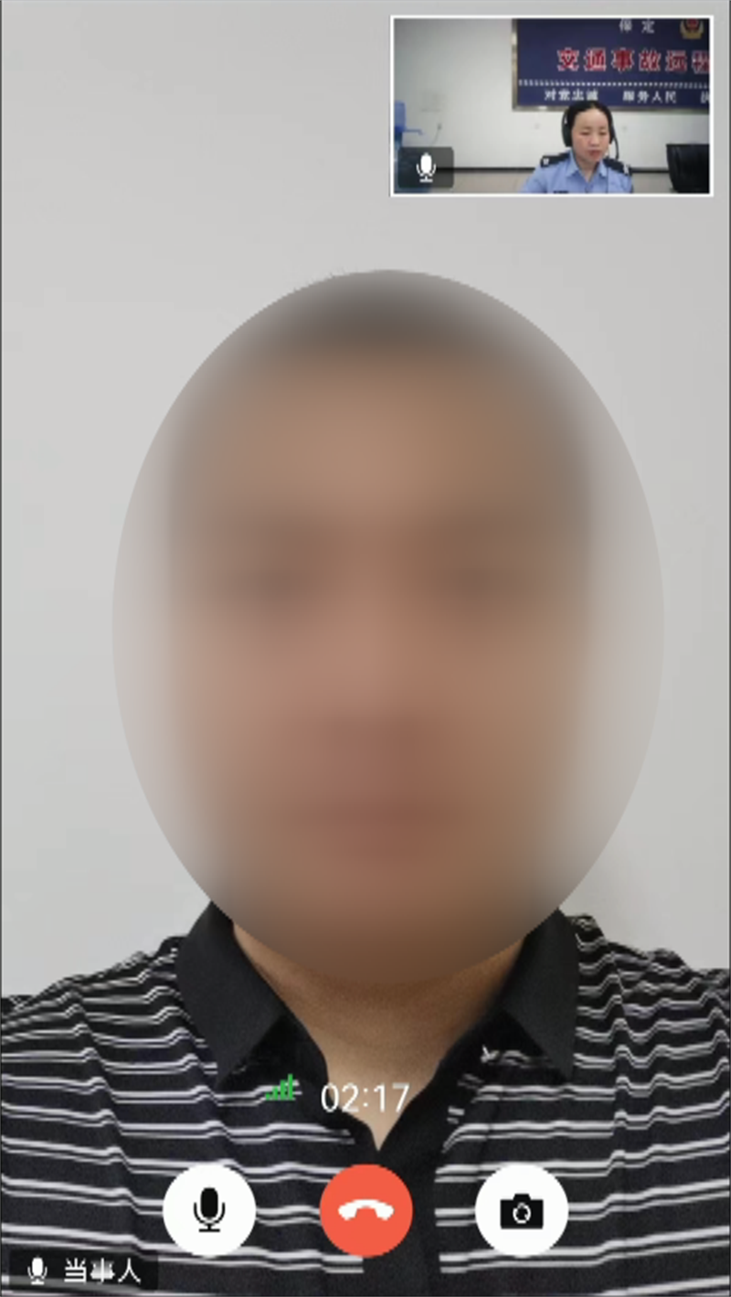 当事人点击视频报警后等待交管部门后台接警员接听,接听后进入视频通话。在处理过程中,当事人持手机可以切换前后摄像头,现场配合取证,在交管部门指导下,完成现场安全防护、损伤情况确认、现场信息采集。