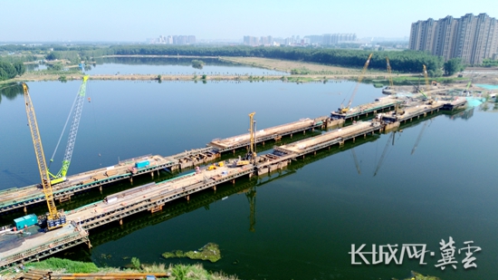 大厂回族自治县与北京城市副中心之间有一条潮白河,正在建设中的厂通路将两地更紧密地连为一体。当前,厂通路潮白河大桥主桥施工正在水中作业。整座大桥由40个大小不一的桥墩支撑,0号墩到26号墩在北京通州区境内,27号墩到39号墩在大厂回族自治县境内,两地同时推进、同标建设、由同一团队施工。