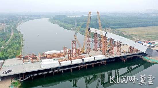 6月9日,记者来到廊坊香河县安石路运河大道至冀京界段建设工程现场,只见北运河香河段碧波万顷,岸上绿树成荫。顶着炎炎烈日,工人们正在进行跨北运河特大桥王家摆桥主桥钢结构拱肋拼装施工,同步进行着路面及附属工程施工。