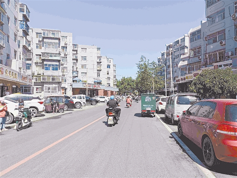 双彩街外墙粉刷一新,路面平整宽阔,车辆停放有序。