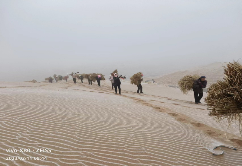 今年春季八步沙林场职工在麻黄塘沙区背草压沙(八步沙林场供图)