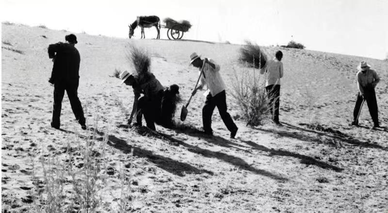 八步沙第一代治沙人在八步沙上压沙时的场景(八步沙林场供图)