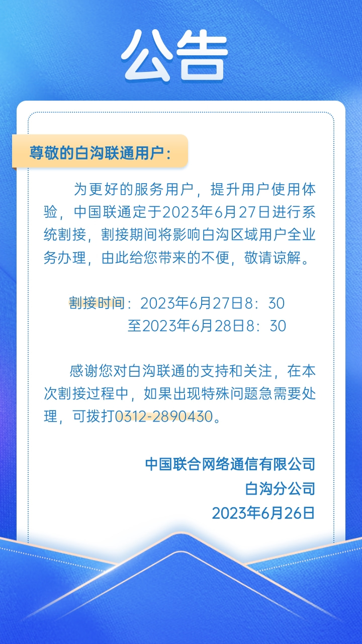 为更好的服务用户,提升用户使用体验,中国联通定于2023年6月27日进行系统割接,割接期间将影响白沟区域用户全业务办理,由此给您带来的不便,敬请谅解。