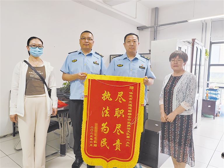 保定晚报讯(记者马骏)近日,米女士一行3人来到保定市交通运输综合行政执法支队第一大队,将写有“热心相助、情暖人心”“尽职尽责、执法为民”的两面锦旗送到执法队员手中。他们握住队员的手,不停地说:“谢谢、谢谢,多亏了你们,救了孩子一命”。