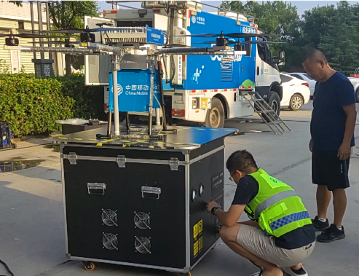 8月5日18时56分,肖官营乡政府周边区域通信恢复。放飞系留式无人机高空基站,肖官营乡政府周边通信恢复,打通抢险救援通信“生命线”(齐永会 摄)。