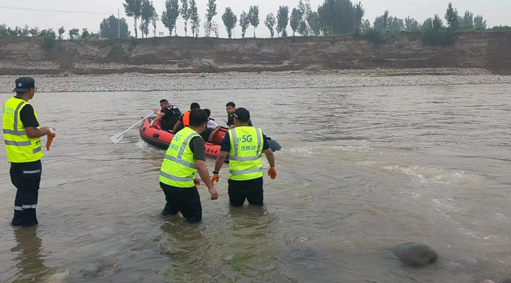 8月3日16时,驾驶冲锋舟跨河架缆紧急抢修孙庄乡南横岐基站,于4日0时30分成功抢通。(谢帅摄)