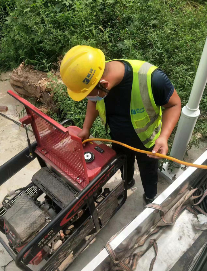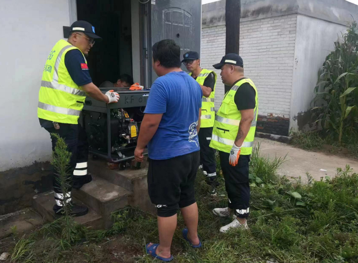 8月6日12时,抢修东仙坡镇王家坟基站,紧急利用发电油机为退服通信设备不间断发电,保证周边村落通讯正常。(李新 摄)