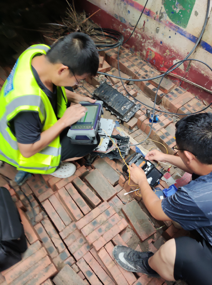 8月7日9时,涿州分公司突击队抢修码头镇向四村附近一级干线光缆故障,在高速桥涵洞下紧急熔纤,绕开洪水区域布放光缆1.5公里,于19时成功抢通,恢复一干业务。(徐佳 摄)