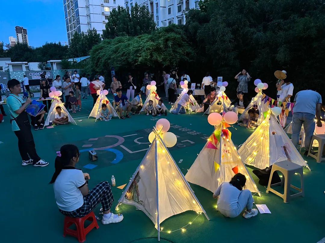 各组参与活动的家庭首先通过“你说我猜”“书摘猜谜”“一起讲故事”等关卡获得相应印章,完成集章后获得DIY帐篷。夜幕下,家长和孩子们用创意装点设计搭起一个个帐篷,处处尽显“家”的温馨和愉悦。