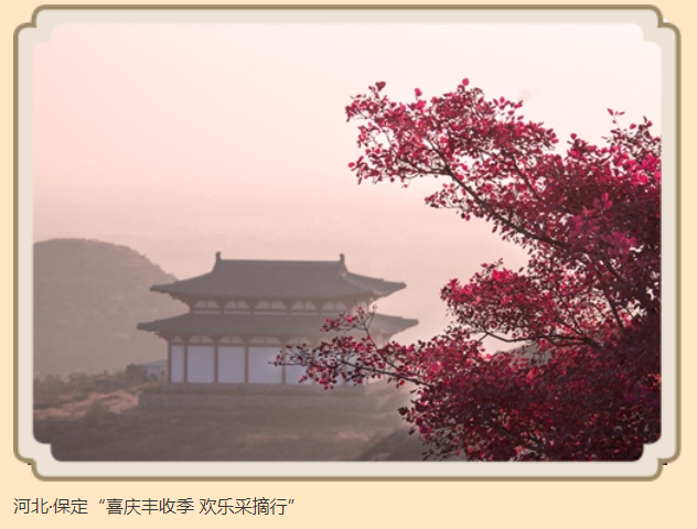 据悉,河北此次有5条线路入选,分别是:“乐享田园风光 畅游诗画邯郸”“新乐‘访羲皇圣里 品甜蜜生活’乡村游”“保定‘喜庆丰收季 欢乐采摘行’”“‘山海揽胜 果香盛竞’之旅”“邢台登山采摘乡村休闲之旅”。