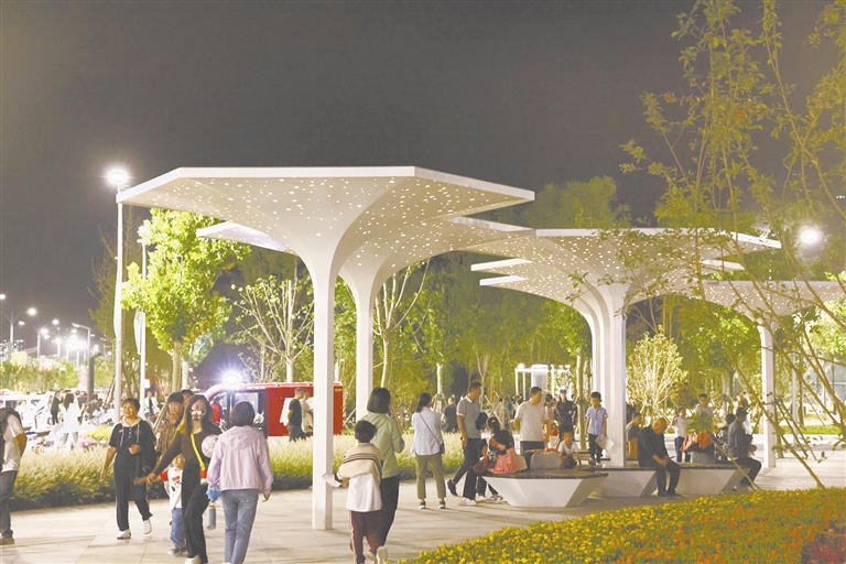 夜幕降临,地标楼宇齐亮灯,公园群光影璀璨,华彩绽放,让保定之夜更添一份活力和烟火气。从上谷天街俯看,熙熙攘攘的游客中流动的欢声笑语交织出一幅时尚感、年轻态的夜娱画卷;向北行驶,以光为主题的拾光公园中,标志性雕塑光环门伴随动感音乐与流光溢彩的喷泉共舞,水、声、光、电、美在此刻与高科技完美融合,夺目至极。夜景、夜游、夜购、夜食、夜娱、夜健,蓬勃的夜间经济点燃了城市的另一种美。
