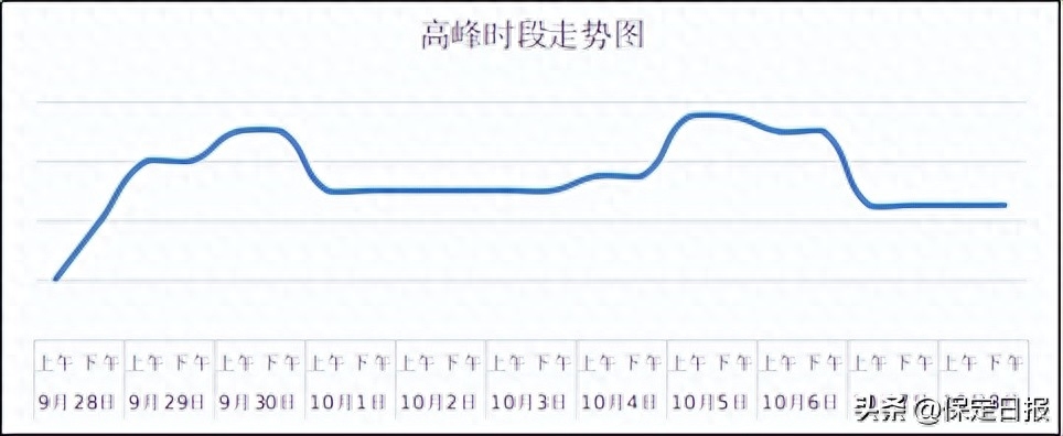 预计从9月28日(假期前一天)下午14时开始流量增长持续至晚20时,22时至29日2时,受零时开始免费影响,部分路段出现短时缓行情况;29日(假期第一天)从早7时开始至晚20时分段出现车流高峰;30日(中秋后一天,假期第二天)预计会出现第二波次高峰;1日至4日流量较日常高位运行,5日至6日为返程高峰,返程高峰时间从早7时至晚22时,间断出现高峰。7日和8日(假期结束后两天为周末)仍可能会出现车流小高峰。