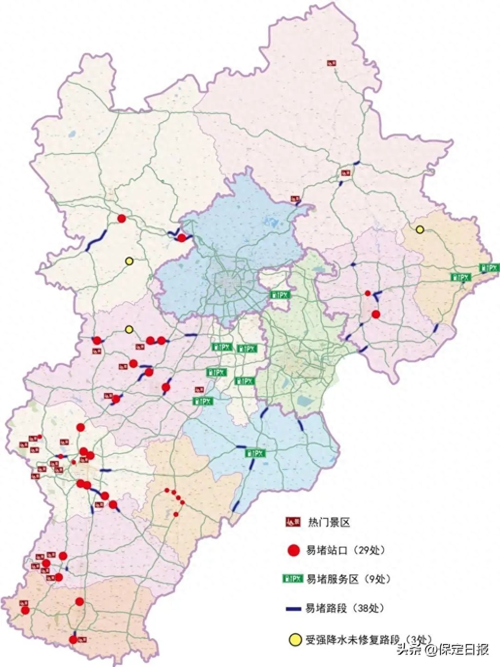预判易堵路段38处,易堵站口29处,易堵服务区9处,受强降水未修复路段3处。