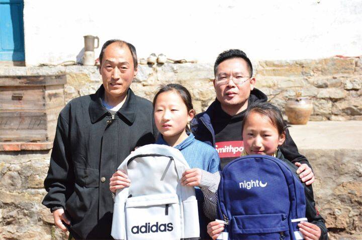 李海成(后排右一)积极回馈社会,为困难家庭学生捐赠学习用品。资料片。