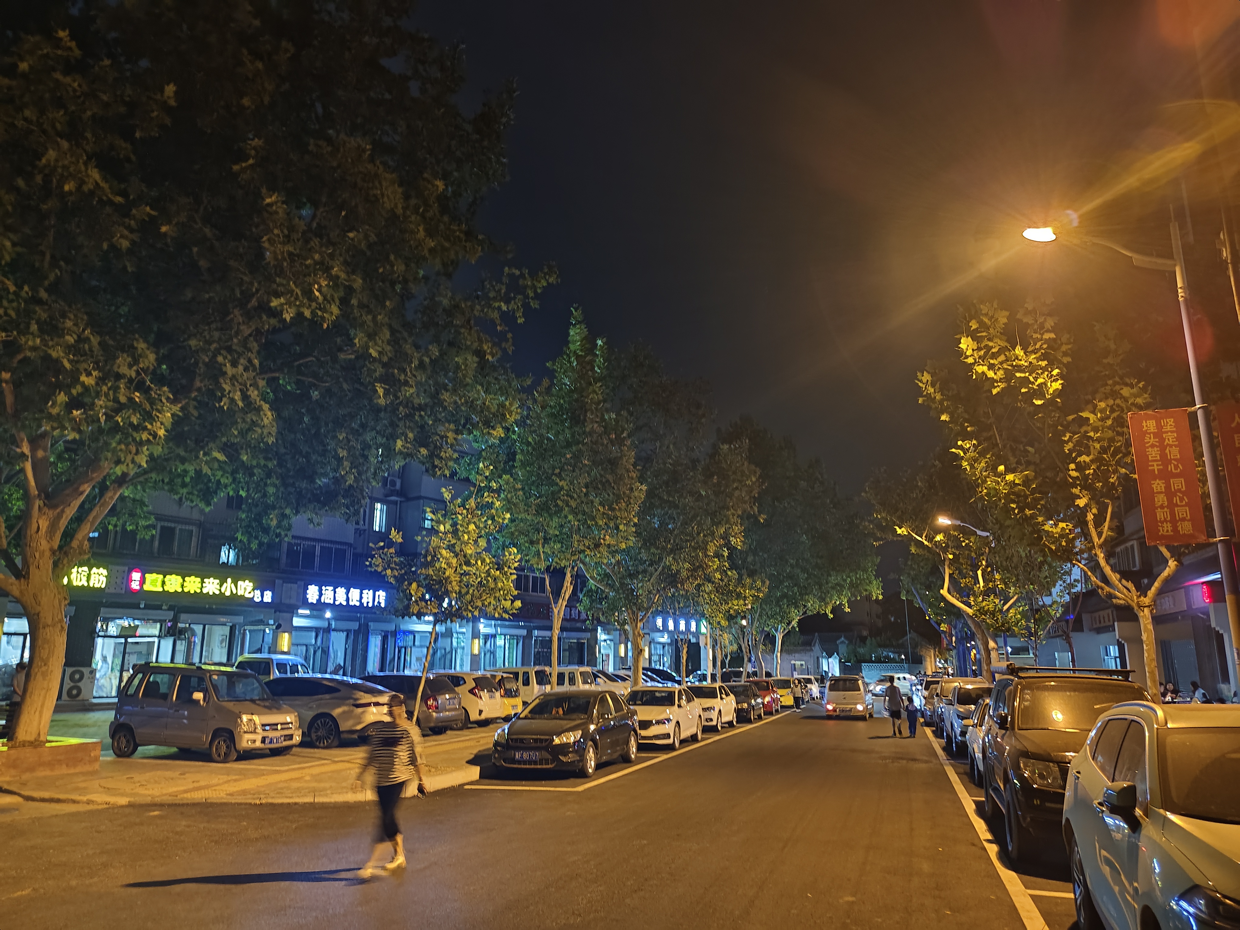 增设停车位,干净整洁的街道在夜晚路灯下充满生活气息。 郝子帅 摄