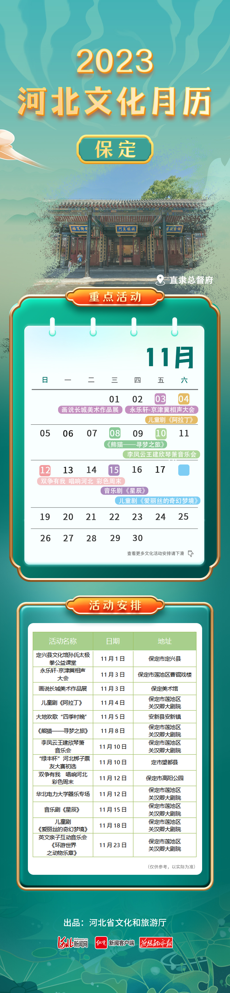 11月,河北省文化和旅游厅继续献上新的重点文化活动月历,为大家推荐形式多样、内容丰富的文化活动。无论您是音乐爱好者,还是戏迷,亦或是话剧迷、书画爱好者……总有一款活动为您量身打造。带上您的期待和好奇,一起来开启精彩的文化之旅,深度体验河北的文化魅力吧!
