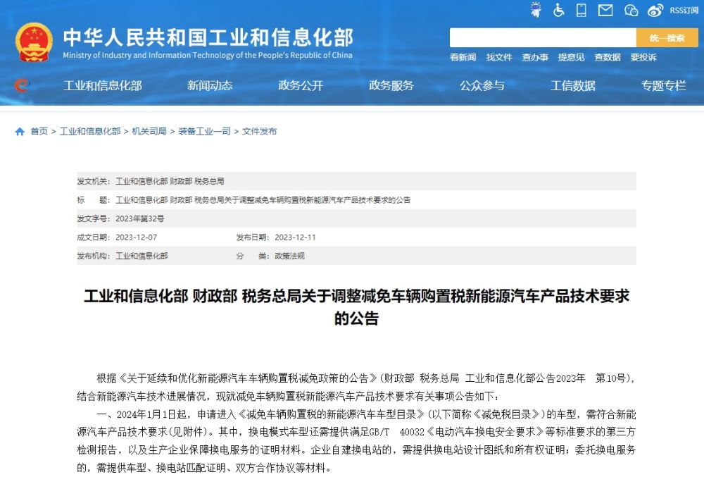 一、2024年1月1日起,申请进入《减免车辆购置税的新能源汽车车型目录》(以下简称《减免税目录》)的车型,需符合新能源汽车产品技术要求(见附件)。其中,换电模式车型还需提供满足GB/T 40032《电动汽车换电安全要求》等标准要求的第三方检测报告,以及生产企业保障换电服务的证明材料。企业自建换电站的,需提供换电站设计图纸和所有权证明;委托换电服务的,需提供车型、换电站匹配证明、双方合作协议等材料。