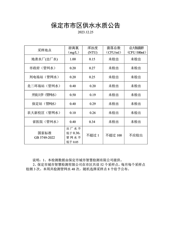 保定市市区供水水质公告