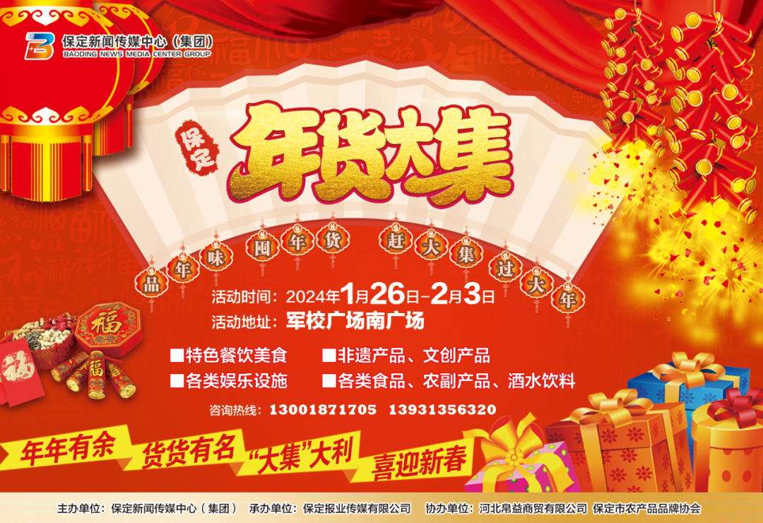 “祥龙贺岁·福满新春·2024保定年货大集”活动将于明日在军校广场开启,活动举办时间为1月26日至2月3日,为期9天。