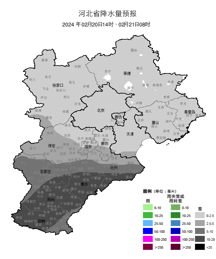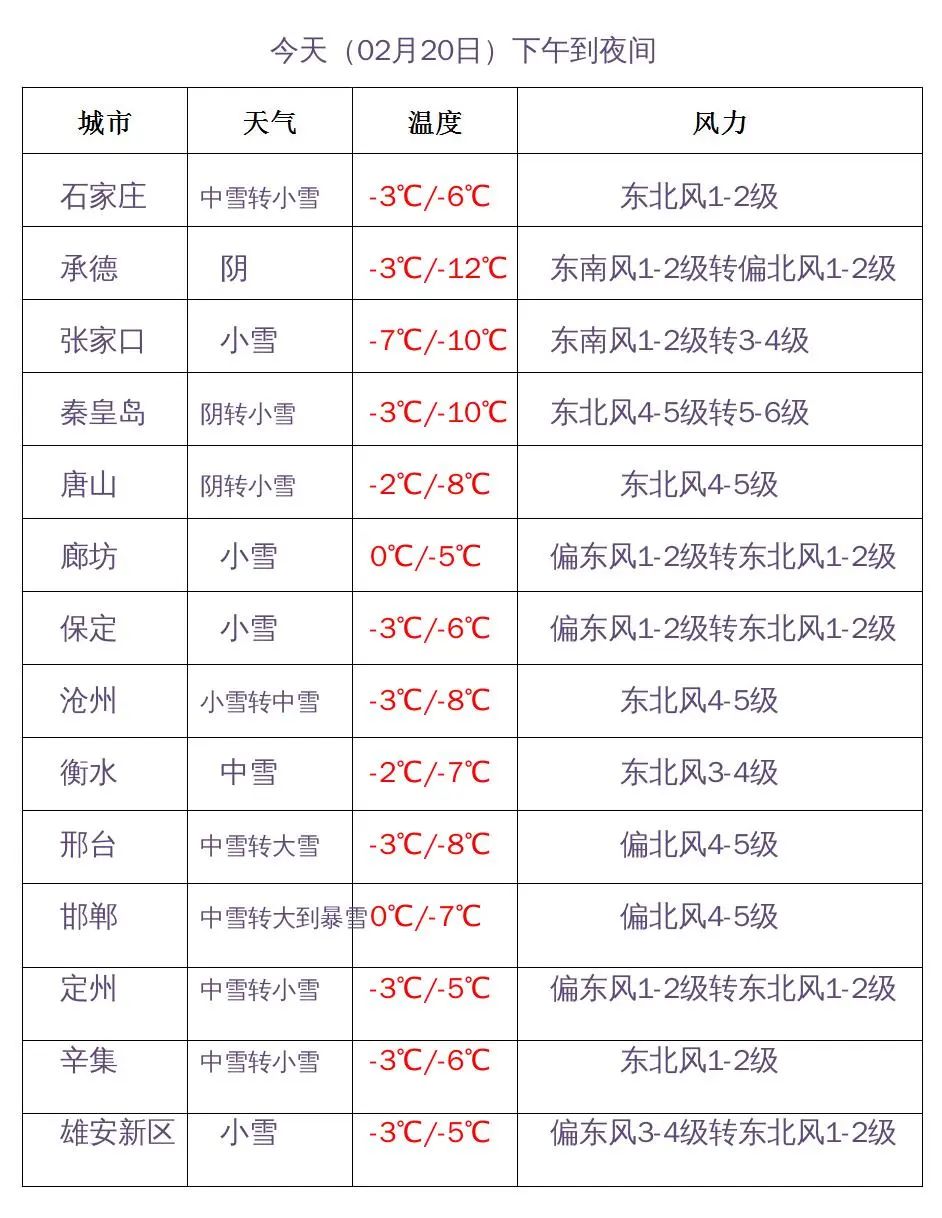 今天下午到夜间,全省阴,张家口南部和保定、廊坊及以南地区有中雪,石家庄、沧州南部、衡水、邢台、邯郸有大雪到暴雪,其他地区有小雪或零星小雪。