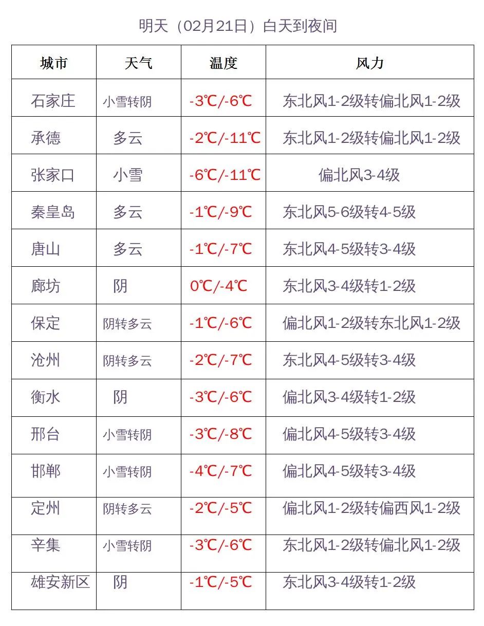 明天夜间到22日,张家口南部和保定、石家庄、邢台、邯郸四个地区的西部阴有小雪或零星小雪,其他地区多云。