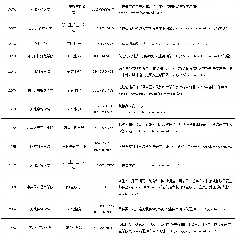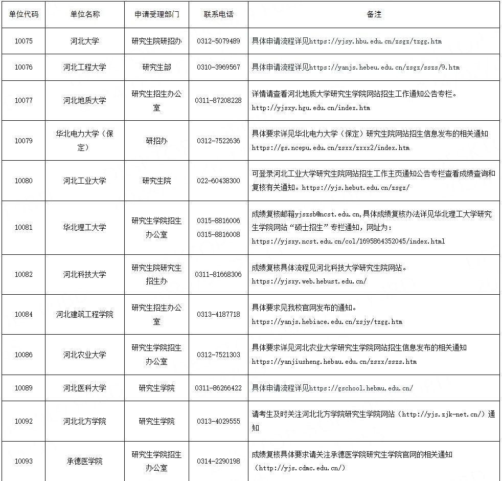 附:河北省2024年全国硕士研究生招生考试(初试)各招生单位成绩复核申请工作联系方式