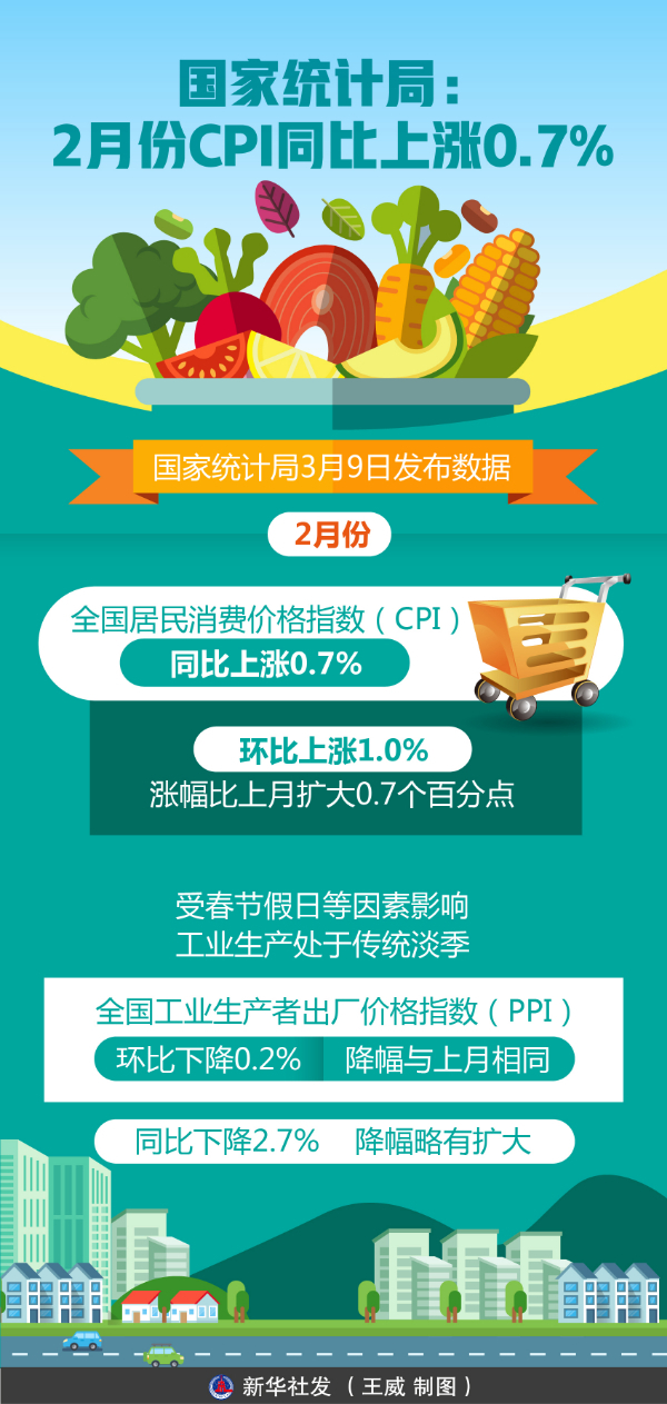 新华社北京3月9日电(记者韩佳诺、魏玉坤)国家统计局9日发布数据,2月份,全国居民消费价格指数(CPI)同比由上月下降0.8%转为上涨0.7%;环比上涨1.0%,涨幅比上月扩大0.7个百分点。