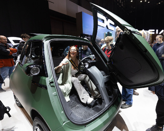 一名观众在2024年日内瓦国际车展上体验微型电动汽车