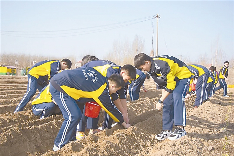 日前,保定泽龙学校组织学生前往吉祥胤农场社会实践基地,开展“播种绿色,拥抱春天”劳动教育实践活动。图为同学们按照生长习性、行距株距等要点,在老师的讲解示范下认真种植土豆。 张陆希 报道