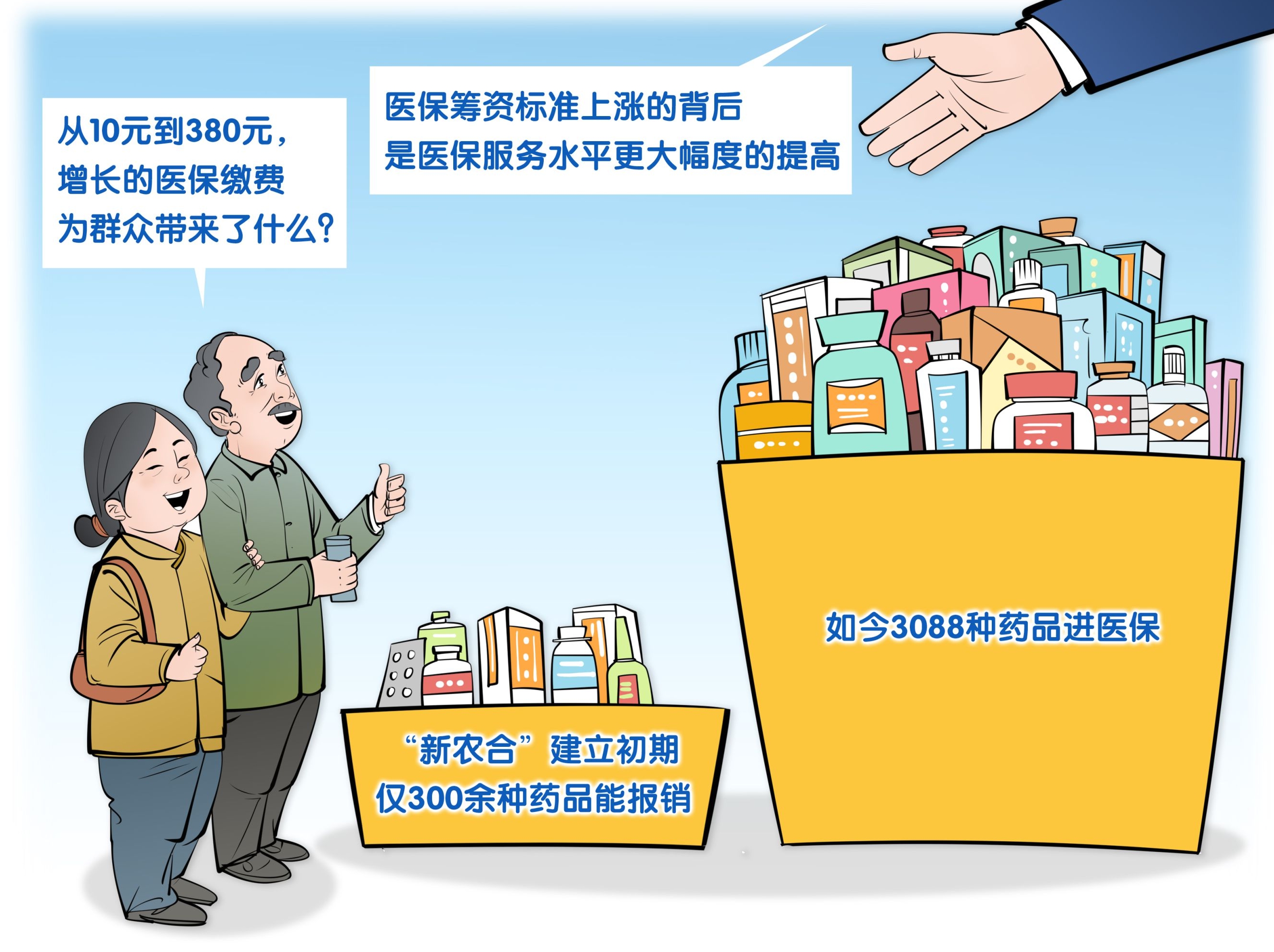 答:有舆论认为,与2003年“新农合”建立时10元/人的缴费标准相比,目前380元/人的居民医保费用缴费标准增长太快。但是,我们不应单纯看缴费标准的增幅,而应该看这增长的370元为广大人民群众带来了什么。事实上,医保筹资标准上涨的背后,是医保服务水平更大幅度的提高。