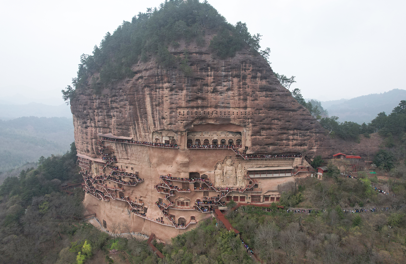 4月5日,游客在位于天水市麦积区的麦积山石窟游览(无人机照片)。 随着“天水麻辣烫”在社交平台走红,甘肃天水成为新晋网红打卡地。清明假期,天水市游客量持续增加。4月4日和5日,天水市分别接待游客30.9万人次和34.86万人次,分别实现旅游综合收入1.77亿元和1.98亿元。 新华社发