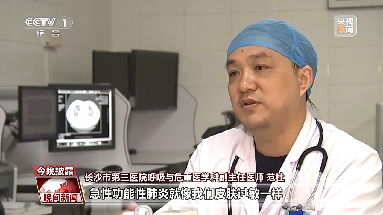 长沙市第三医院呼吸与危重医学科副主任医师 范杜:急性功能性肺炎就像我们皮肤过敏一样,长了风坨,可能长得那一下又痒又痛,但是过一段时间它就消掉了,那么肺部的过敏也是一样,只是如果吸入量不是很大,这个过敏反应不是很重的话,很快就消掉了。