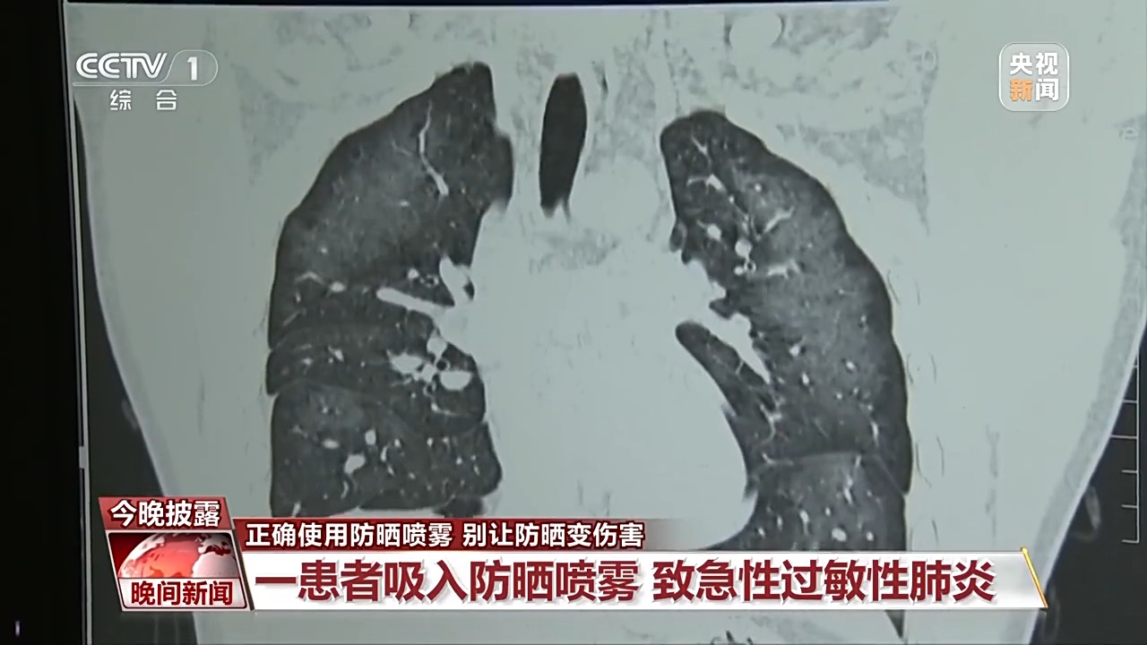 前不久,长沙市第三医院急诊科来了一位年轻患者,他因呼吸困难和咳嗽前来就诊。多维度CT检查发现,这位患者的双肺呈现大面积对称性的白色磨玻璃影,也就是我们俗称的白肺。患者自己叙述说,因为天气暴晒,他在出门前使用了防晒喷雾,是对着自己的脸部喷的,当时没有屏住呼吸,随后咳嗽持续了一天,大概九个小时以后,他已经感觉到呼吸非常困难了。医生表示,基本可确定是防晒喷雾吸入之后肺部发生了过敏性反应,引起了肺水肿的病变,从而导致了急性过敏性肺炎。
