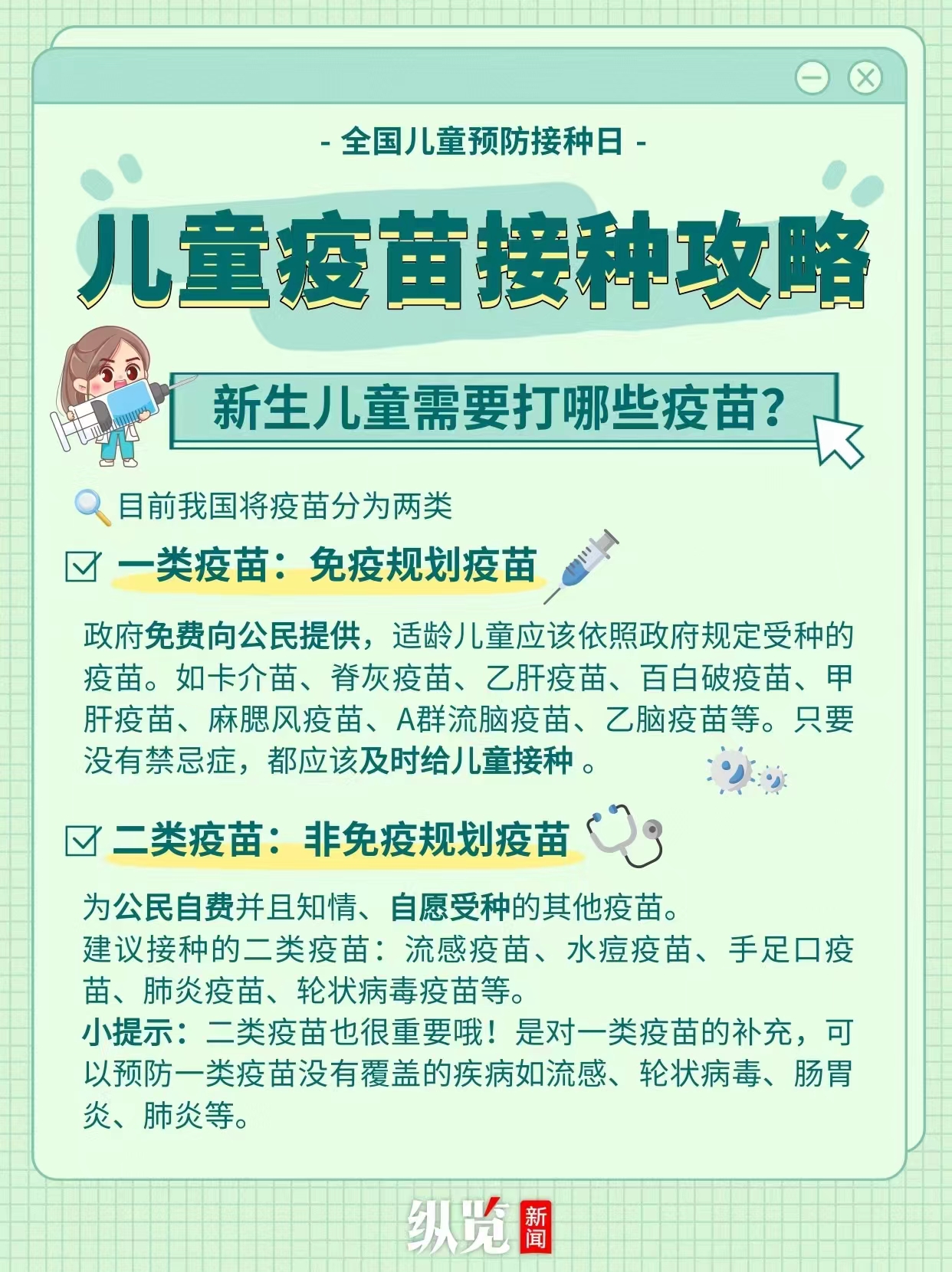 2024年4月25日是我国第38个“全国儿童预防接种日”,今年的主题是“共同行动 接种疫苗 为全生命周期护航”。新生儿身体尚未发育完善,尤其是免疫系统还很脆弱,很容易受到外界病毒的影响。接种疫苗是预防和控制传染病最经济、最有效的措施。那么对于刚刚完成身份升级的新手爸妈,需要给孩子接种哪些疫苗?什么时间接种?有哪些注意事项?一起来了解一下吧!