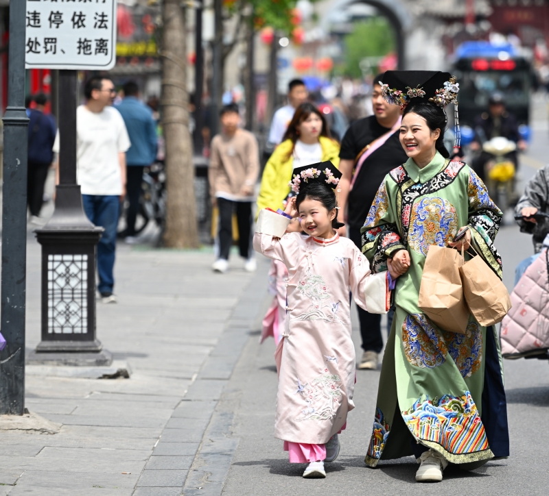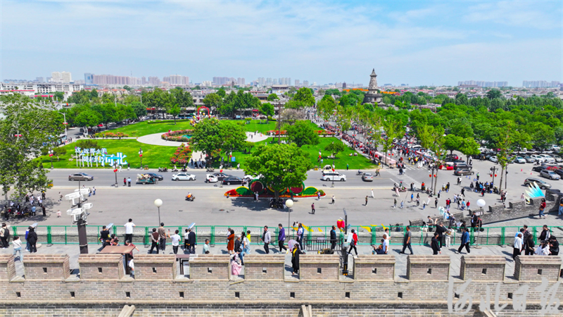 5月1日,游客们在正定南城门景区游玩。 河北日报记者 史晟全摄